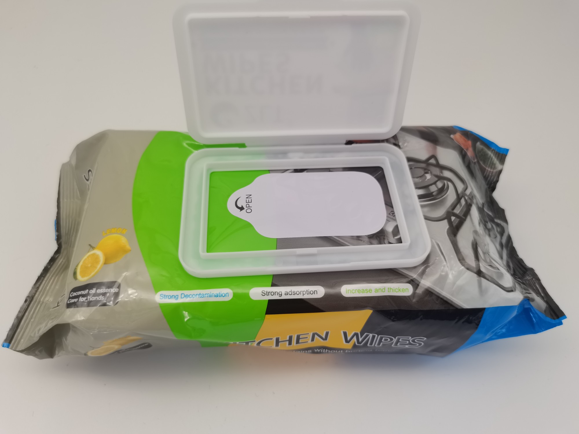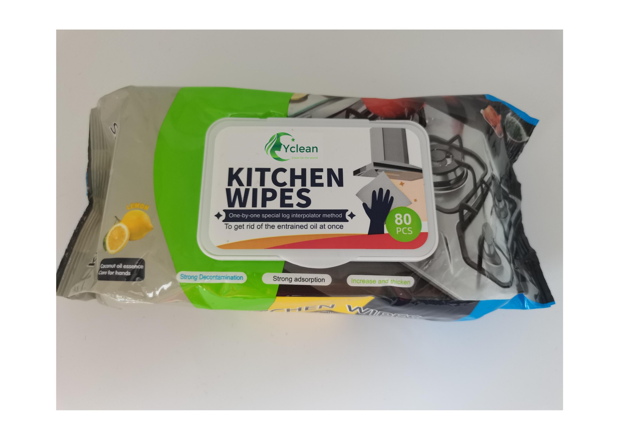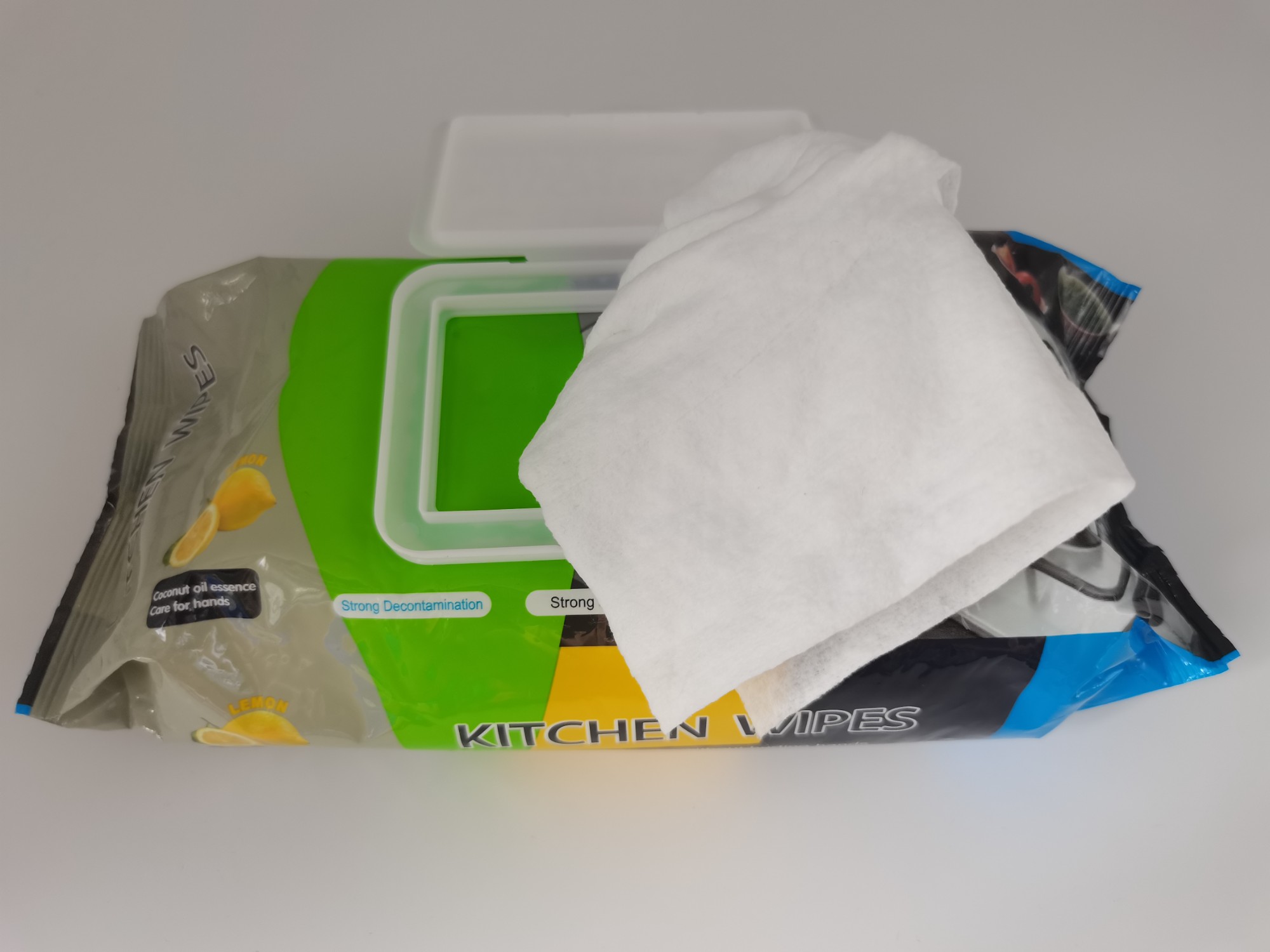 This products uses purified water, spunlaced non-woven fabric, coconut oil essence, lemon essence, aloe essence, efficient decontamination factor, and sweet orange essence.